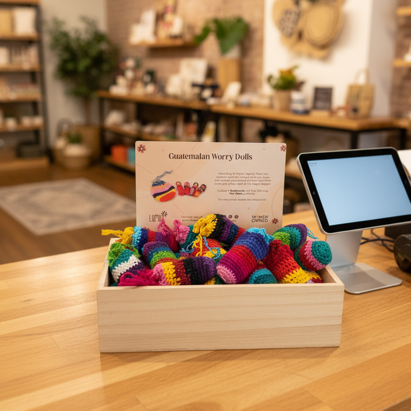 Add a whimsical touch to your shop with these handmade and fair trade Worry Dolls from Guatemala. Each pouch includes four 2" tall dolls, adorned in vibrant attire and snugly nestled inside a brightly crocheted bag crafted by artisans Juana and Maria.